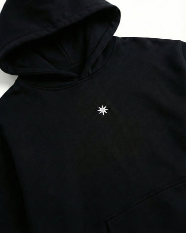 500 GSM heavyweight cotton hoodie with a soft brushed interior, ribbed cuffs and hem, kangaroo pocket, and a minimal embroidered 8-point star logo on the chest. Relaxed fit with a structured hood and clean, heavyweight drape.